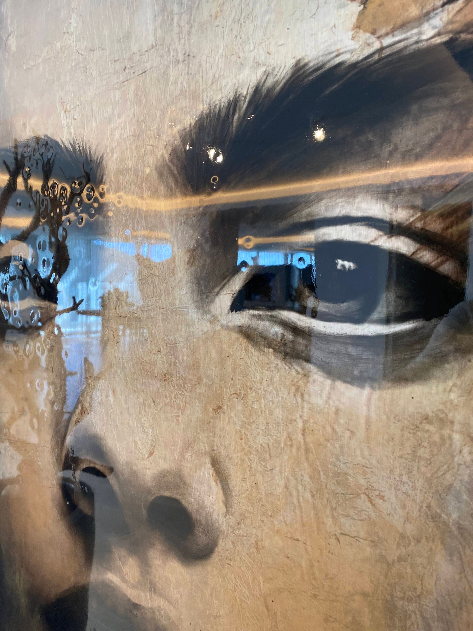 Painted with acrylic and gold on aluminum, the surface adds a modern twist, reflecting light in unexpected ways that enhance the portrait's dynamic presence. The rich texture invites viewers to explore the contrast between the smooth metallic background and the tactile brushwork of the figure. A layer of shiny resin seals the piece, bringing depth and luminosity while adding an ethereal quality that transcends traditional portraiture.